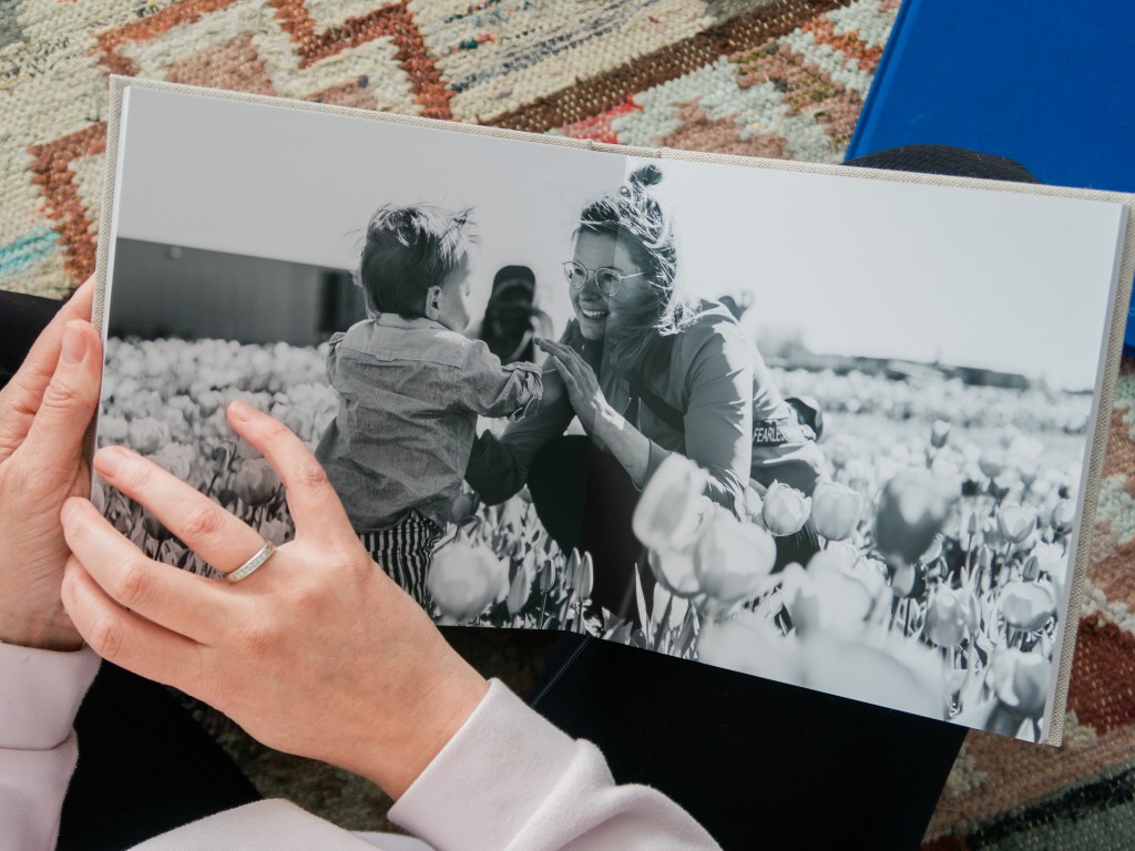 Een beeld zegt meer dan 1000 woorden. Vertel je verhaal in beelden. Niet in tekst. Of zoals ik ook nog wel eens doe, deel je boek in, in hoofdstukken met alleen titelpagina. Dan is de tekst ondersteunend aan de pagina’s die volgen. Bijvoorbeeld wanneer je tijdens het eerste jaar een grote reis maakte met je baby. Of mijlpalen zoals de kraamweek of 9 maanden. Momenten waarop je altijd net even wat meer foto’s maakt.