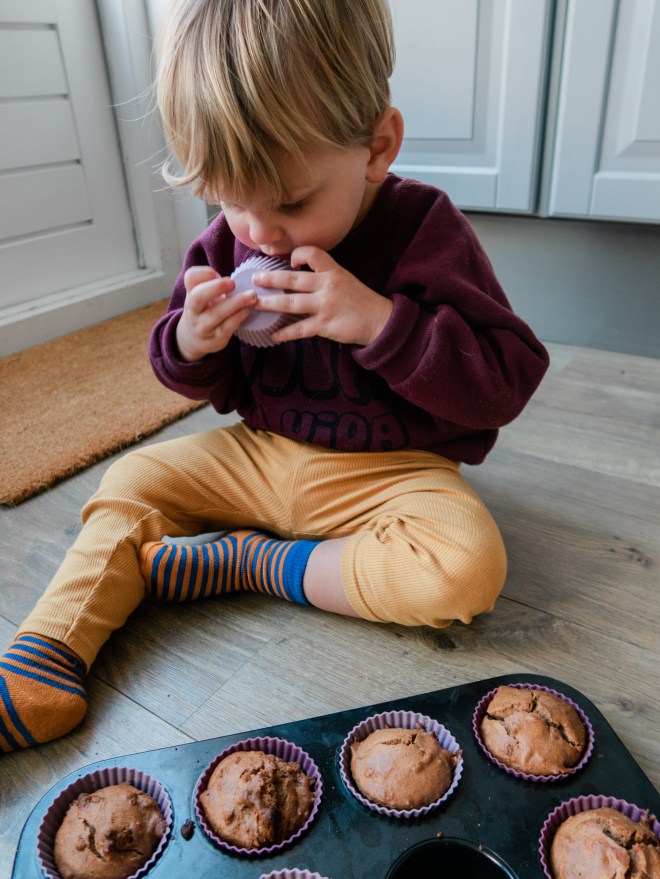 Als er één ding is wat ik mijn kleintje graag wil leren, dan is het bakken en koken. Dus had ik dat natuurlijk al helemaal geromantiseerd en zie ik ons al samen in de keuken staan. Deze keer een nieuwe bakpoging in de categorie bakken met kinderen: muffins met kruidnootjes.
